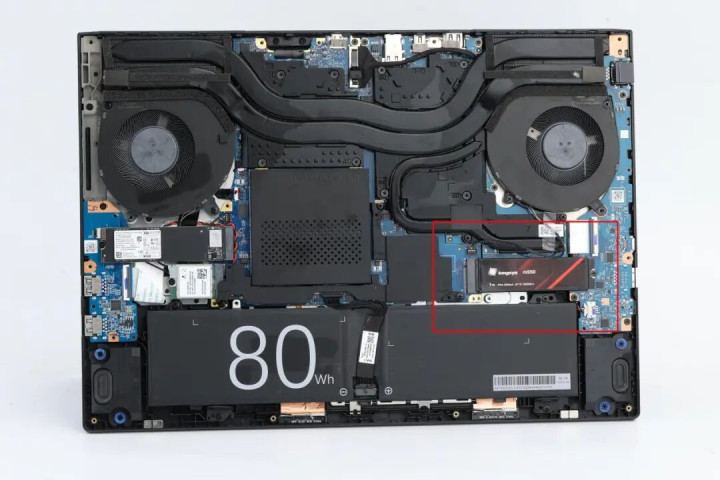 ▲借助散热拓展卡,江波龙mSSD可以轻松安装在机械革命蛟龙16Pro游戏本右侧的M.2 SSD插槽中。