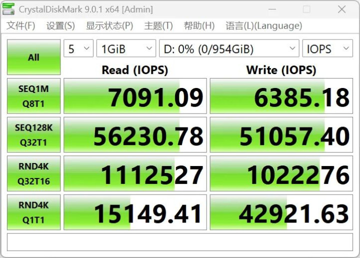 ▲以IOPS为单位显示的江波龙mSSD 1TB CrystalDiskMark测试成绩