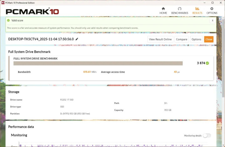 ▲江波龙mSSD 1TB的PCMark 10完整系统盘测试得分为3874分