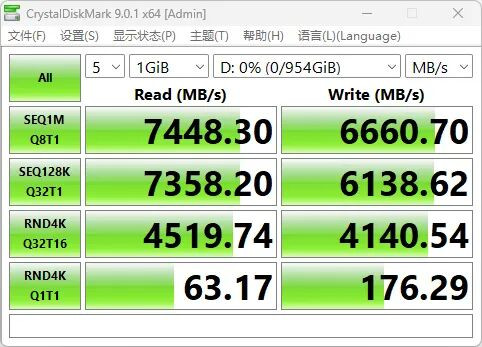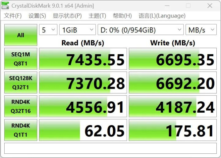 成绩令人欣喜,江波龙mSSD 1TB在测试中的表现非常优秀,其顺序读取速度小幅超越标称的最高7400MB/s,在CrystalDiskMark中的顺序读取速度高达7435.55MB/s,同时其顺序写入速度也达到了6695.35MB/s,同样超越其标称最高6500MB/s的顺序写入速度。值得称赞的是,江波龙mSSD 1TB还有非常优秀的随机读写能力,它的随机4K Q32T16读写速度分别为4556.91MB/s、4187.24MB/s,换算过来其4K随机读写性能分别达到1112K、1022K。而它的标称随机4K读写性能分别为1000K、820K,显然,江波龙mSSD 1TB的随机性能在测试中的表现也要更好一些。其顺序读写、随机读写性能已经可以与WD_BLACK SN7100、Kingston FURY叛逆者这些性能较高的PCIe 4.0产品媲美,明显优于顺序读取速度不到7000MB/s,随机4K Q32T16读写性能不到1000K IOPS的主流PCIe 4.0固态硬盘。