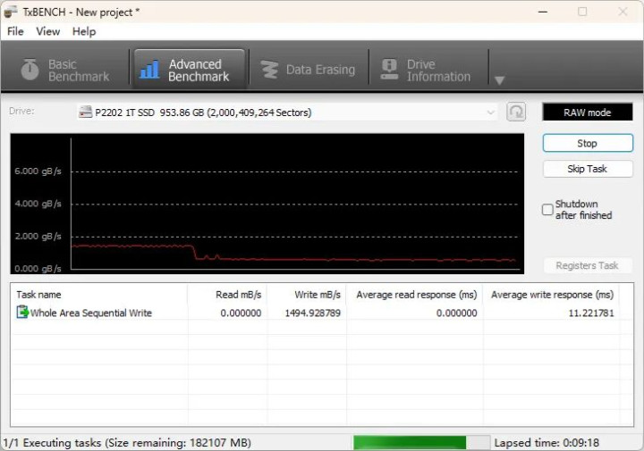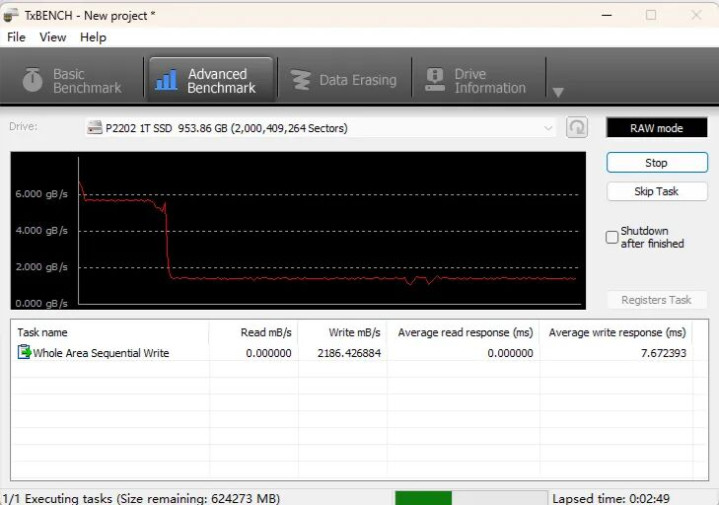 值得称赞的是,在进行全盘写入时,我们发现其1TB产品尽管容量不算大,实际可用空间也就953.9GB,但仍设置有一个容量较大的SLC Cache缓存,约有158GB。在这个范围内进行顺序写入的话,其写入速度可以达到5000MB/s~6700MB/s,超出这个范围后才会出现掉速。