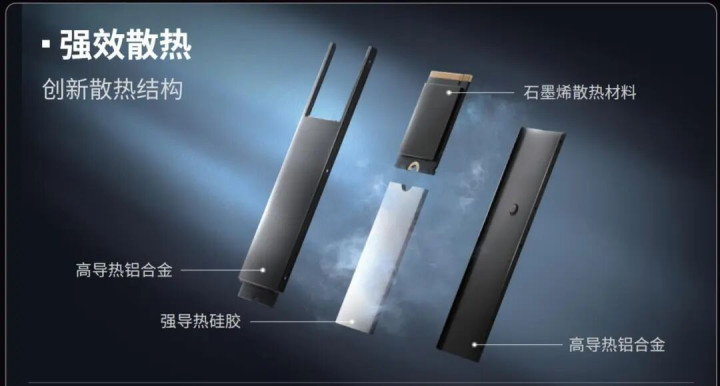 第二大功能是加强mSSD的散热,前面提到拓展卡的材质为高导热铝合金、强导热硅胶,同时,江波龙还会在mSSD的正面贴上一层内含石墨烯材质的标签,mSSD的核心芯片也采用了石墨烯材质。因此标签不仅可以用来显示产品型号,还能借助石墨烯优秀的导热性能将芯片散发出的热量传导到标签上,再传导到拓展卡的铝合金散热片,实现快速散热、降温。虽然拓展卡的铝合金散热片材质并没有覆盖核心芯片,但根据江波龙官方数据,安装拓展卡后可以保证固态硬盘的性能释放。较未安装拓展卡前的峰值性能维持时间提升4.3倍,稳定后最低速率提升2.5倍。因此在后续测试中,我们将先测试安装主板M.2 SSD散热片、石墨烯标签与散热拓展卡后的江波龙mSSD性能表现,还将在仅贴有石墨烯标签、安装散热拓展卡的环境下,测试江波龙mSSD是否能稳定工作。