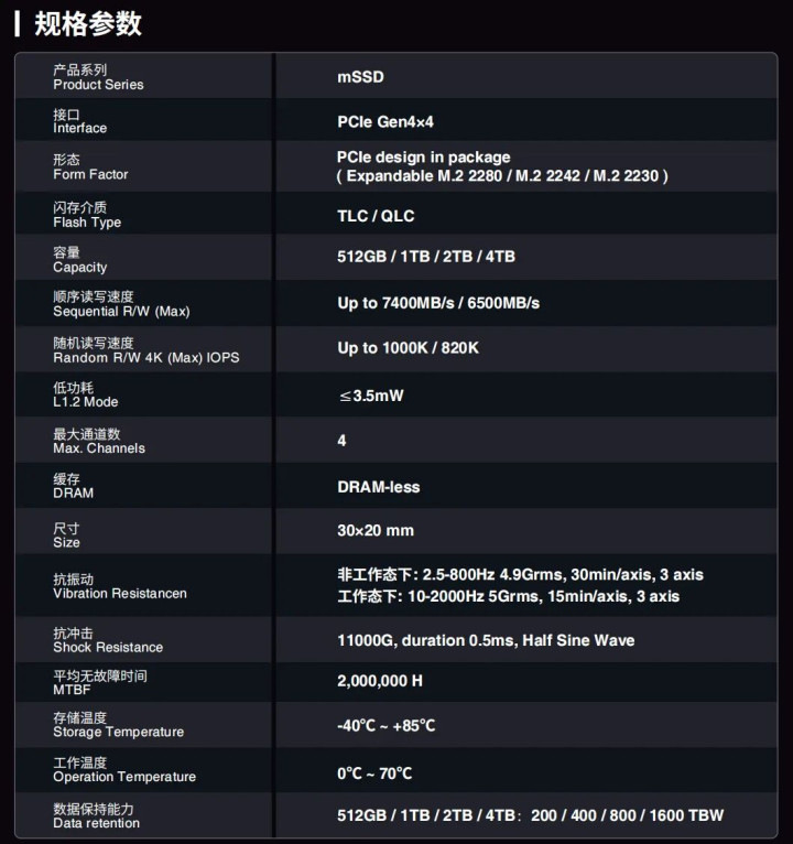 规格方面,为尽可能做得小,因此江波龙mSSD采用了先进的PCIe 4.0 DRAMLESS主控,支持最新的NVMe 2.0标准、4通道读写。它不需要外置独立内存颗粒作缓存,可占用少量系统内存来临时保存已从闪存读取的数据、需要写入闪存的数据,以及地址映射表,从而有效提升SSD的I/O性能,无须再使用独立的内存颗粒作缓存,能有效减小整块集成封装芯片的占用面积,固态硬盘的功耗与发热量。