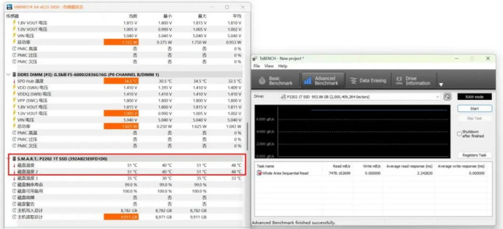 ▲在Txbench全盘读取测试中,江波龙mSSD 1TB的全盘平均顺序读取速度达7478.163MB/s,读取1TB数据后核心芯片的工作温度为51℃。