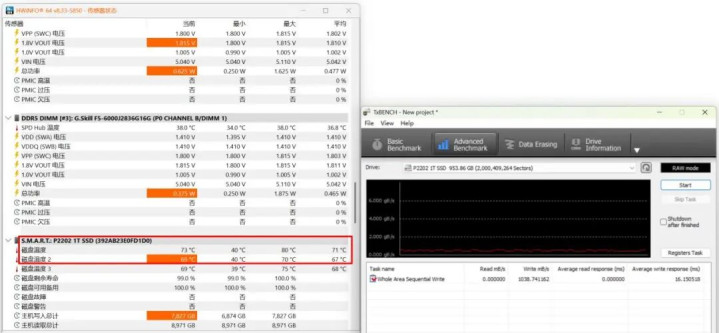 最后,我们还进行了压力更大的Txbench全盘读写测试。首先在没有安装散热片时,江波龙mSSD 1TB的全盘读取性能未受明显影响,其全盘顺序读取速度仍能达到7477.878MB/s,工作温度较配备散热片时上升了8℃,达到59℃。而在功耗更高、发热量大的全盘写入测试中,由于没有安装主板SSD散热片,江波龙mSSD 1TB的温度的确会有明显上升,但得益于优秀的温控机制,其平均温度控制在71℃左右,完成1TB数据写入后的核心芯片工作温度为73℃。因此它的全盘平均写入速度仍然能突破1000MB/s,达到1038.741MB/s,优于不少主流产品。