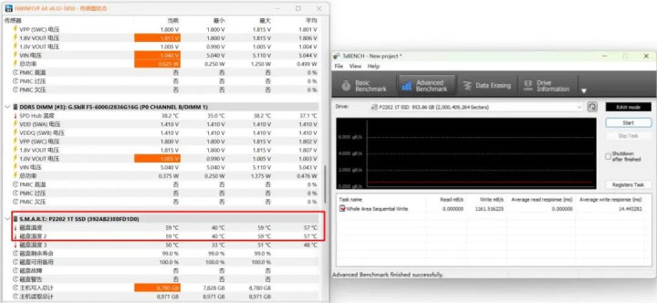 温度方面,因为固态硬盘在执行写入时会达到最高功耗,所以江波龙mSSD 1TB在执行写入任务时的温度有所上升,但并不算高。在搭配主板M.2 SSD散热片、石墨烯标签与散热拓展卡的环境下,写入1TB数据后的核心芯片工作温度为59℃,不到60℃,相比部分采用多芯片设计,相近环境下测试的固态硬盘还要低一些。