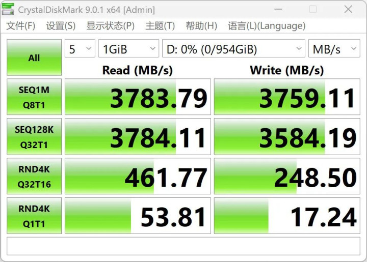 通过CrystalDiskMark测试,可以看到江波龙mSSD 1TB能够完全释放出USB4接口的传输带宽,其最高顺序读写速度分别为3784.11MB/s、3759.11MB/s,达到高性能USB4移动存储设备的水准,远优于传输速度在1000MB/s左右的USB 3.2 Gen 2移动固态硬盘,以及传输速度在2000MB/s的USB 3.2 Gen 2×2移动固态硬盘。