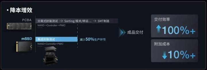 该技术通过晶圆(Wafer)级系统级封装(SiP)工艺,一次性把主控、NAND闪存、PMIC电源管理芯片与无源元件(电阻、电容)等元件整合进单一封装体内,并实现它们之间的电气连接、物理保护与热管理。这样设计的好处是可以将原本固态硬盘上近1000个的焊点减少至0个,规避了固态硬盘在生产中可能出现的阻焊异物、撞件隐患与高温高湿、腐蚀性等可靠性问题。同时,mSSD的生产制造还省去了PCB贴片、回流焊等多道SMT环节及各站点转运,可以有效提升生产效率、降低生产管理成本,实现降本增效的目的。