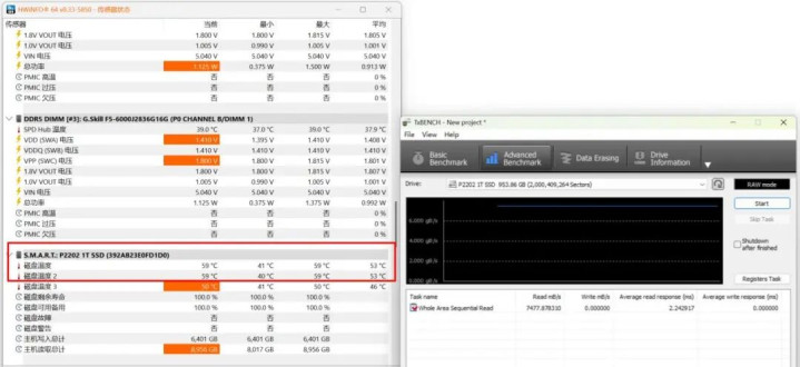 ▲未安装主板散热片时的全盘平均顺序读取速度可达7477.878MB/s,温度为59℃。