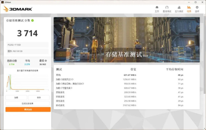 在游戏性能的考察上,我们使用了3DMark存储性能测试,该测试会考察《战地5》《使命召唤:黑色行动4》《守望先锋》三款游戏在SSD上从启动到菜单的速度,并测试SSD在一边玩游戏一边录制视频时的性能,以及在安装游戏,复制游戏文件的性能表现。江波龙mSSD 1TB的表现也很不错,其总分达到3714分,平均传输速度为631.67MB/s。根据我们之前进行的一些测试来看,主流PCIe 4.0 SSD在该测试中的得分一般不到3000分,只有定位较高的PCIe 4.0 SSD才能获得3500分以上的测试成绩,这也表明江波龙mSSD 1TB的游戏性能达到了高性能PCIe 4.0 SSD的水准,能更快地启动、安装与存储游戏。