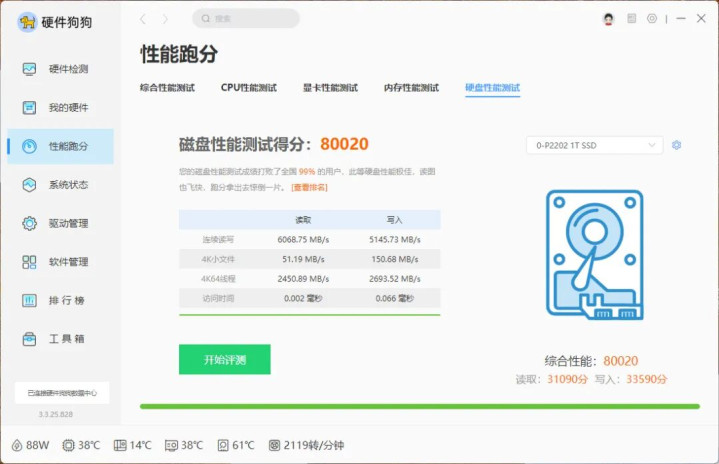 在另一款可以进行全国排名的《硬件狗狗》磁盘性能测试中,虽然由于测试方法不同,江波龙mSSD 1TB的读写数值没有前面几款软件那么亮眼,但它的得分在成绩库中仍然打败了全国99%的用户,因此也得到了软件给出的“此等硬盘性能极佳”的评价。
