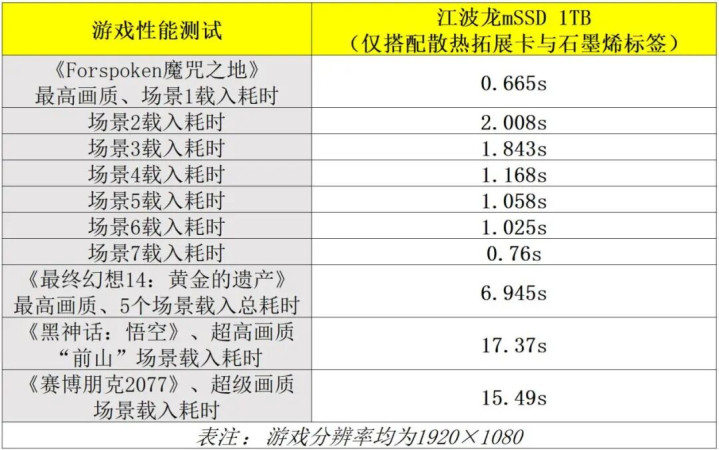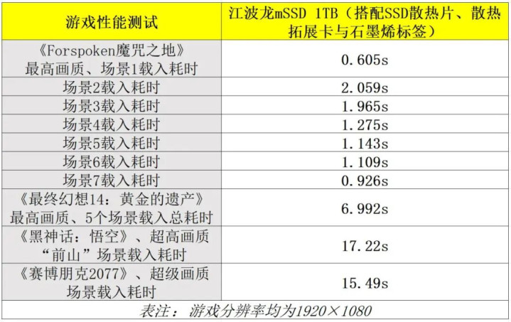 ▲江波龙mSSD 1TB加载《赛博朋克:2077》单个关卡的耗时只需15.49s
